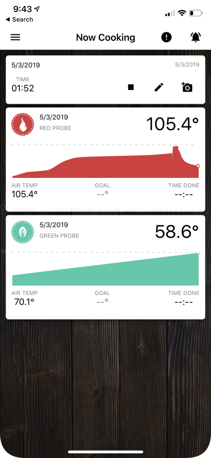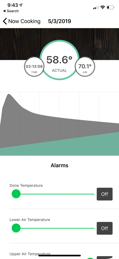 We designed it so as you tap and slide your finger along the temperature curve, you can see the exact internal and ambient temperature at the same time. You can either pick your type of meat and weight, and the app will do the timing for you to get a perfect cook - or you can go full manual and just monitor your cook as you got.